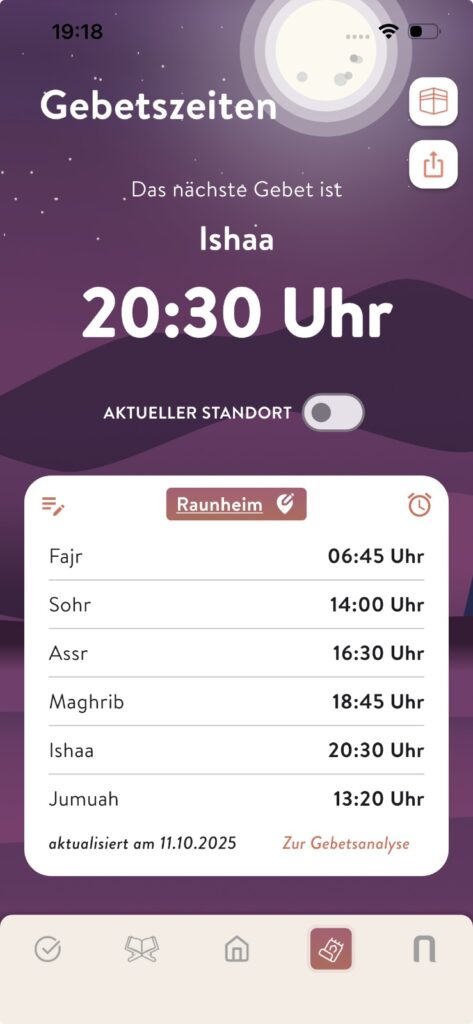 Nach Standortfreigabe siehst du die lokalen Gebetszeiten. Alternativ kannst du eine Moschee auswählen und deren Zeiten anzeigen. Du kannst dir Wecker stellen (Icon oben rechts). Die Qaideen haben die Möglichkeit über das Edit-Icon die Zeiten für ihre Moschee/Namaz-Center zu pflegen. Oben rechts gibt es zwei Shortcuts: Qibla-Finder und Gebetszeiten teilen.